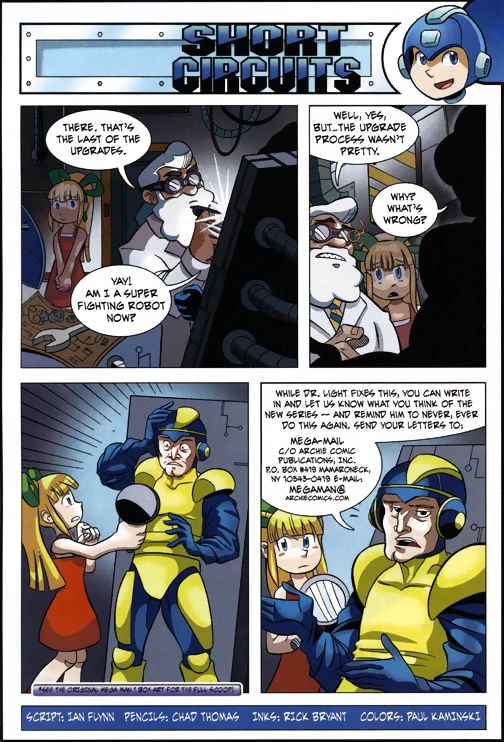 Bad Box Art Mega Man tiene otra aparición en el "Corto Circuitos" del Número #1. Aquí, en el momento en el que el Dr. Light transforma a Rock en Mega Man, por accidente lo transforma en Bad Box Art. El Dr. Light se siente molesto pues no le agrada mucho la apariencia de Mega Man. Roll sorprendida le pasa un espejo a Mega Man, y éste mira horrorizado su nueva apariencia.