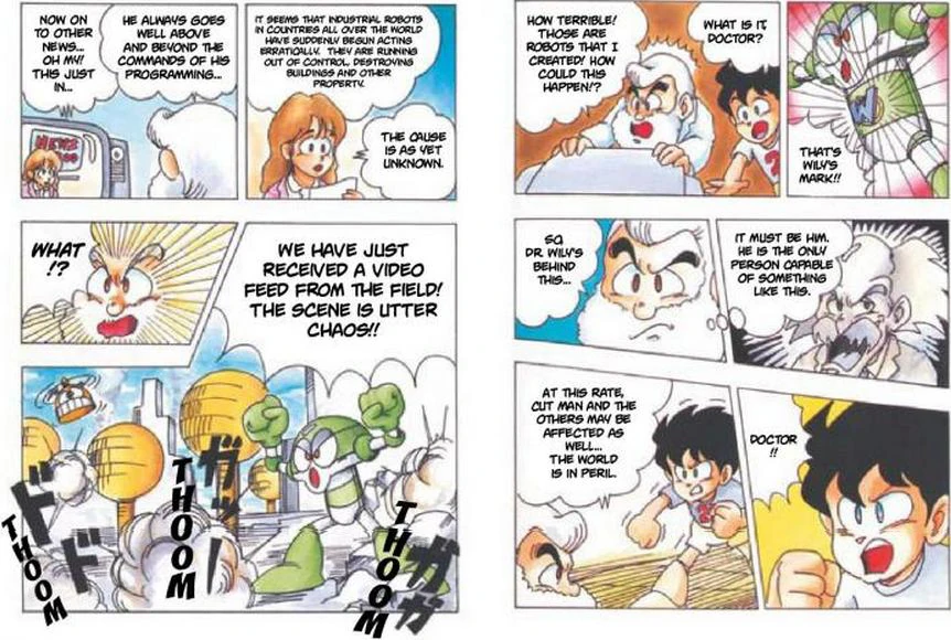 Dr. Light: ¡Esa es la marca de Wily! Entonces, el Dr. Wily está detrás de esto... debe ser él. Es la única persona capaz de algo como esto. A estas alturas, Cut Man y los otros debieron ser afectados también... el mundo está en peligro.