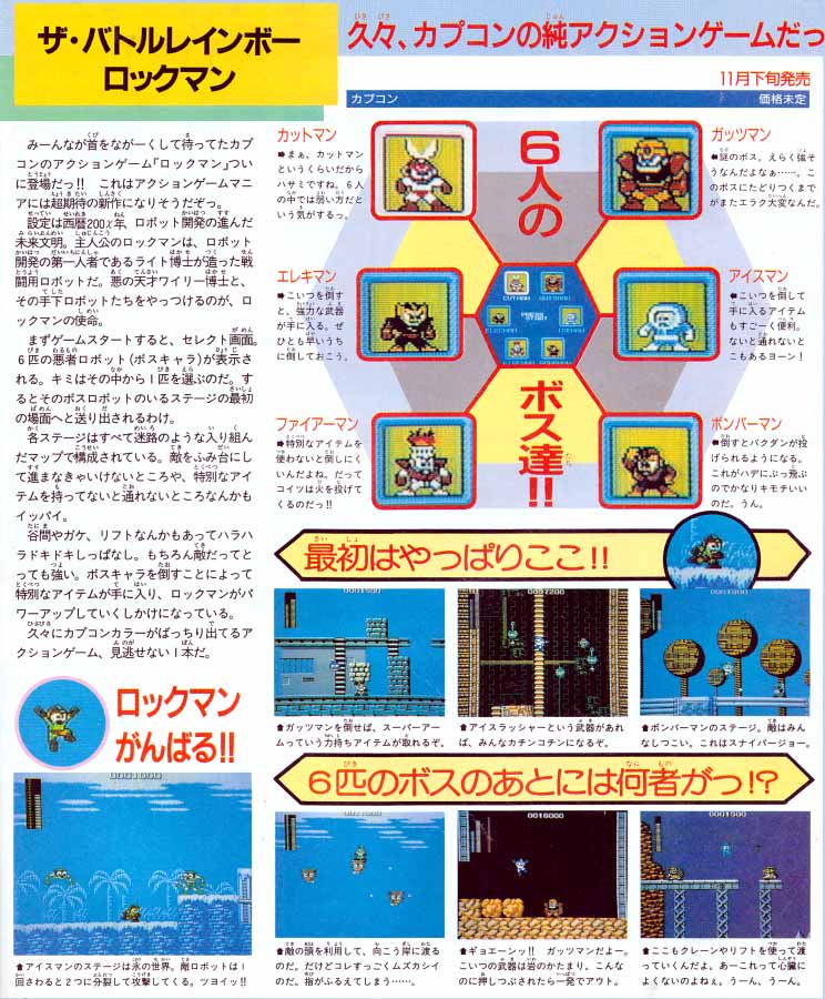 La edición del 2 de Octubre de 1987 de la revista Famitsu muestra algunas capturas de pantalla de la versión prototipo del primer "Rockman", llamada The Battle Rainbow Rockman (ザ・バトルレインボーロックマン Za Batorureinbō Rokkuman?, Trad. El Guerrero Arcoiris Rockman). El único detalle que salta a la vista, es en la selección de escenario, donde la frase SELECT STAGE aún no ha sido incluida, solo estando presente PRESS START.[17]
