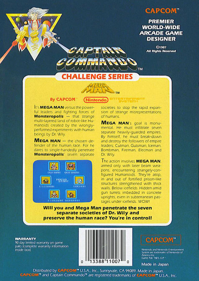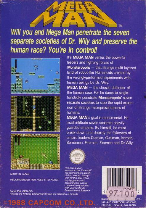 Mega Man, conocido en Japón como Rockman (ロックマン Rokkuman?), es el primer videojuego de "Mega Man", el primer videojuego de la línea principal de "Mega Man", y la primer entrega para Nintendo Entertainment System. Fue desarrollado por Capcom en 1987, bajo la dirección de Akira Kitamura y con Nobuyuki Matsushima como programador principal. Fue estrenado para la consola Famicom de Nintendo el 17 de diciembre de 1987; siendo localizado en occidente ese mismo mes. "Mega Man" fue producido por un pequeño equipo específicamente para el mercado de consolas domésticas, una novedad para Capcom, que anteriormente se centraba en los videojuegos arcade.