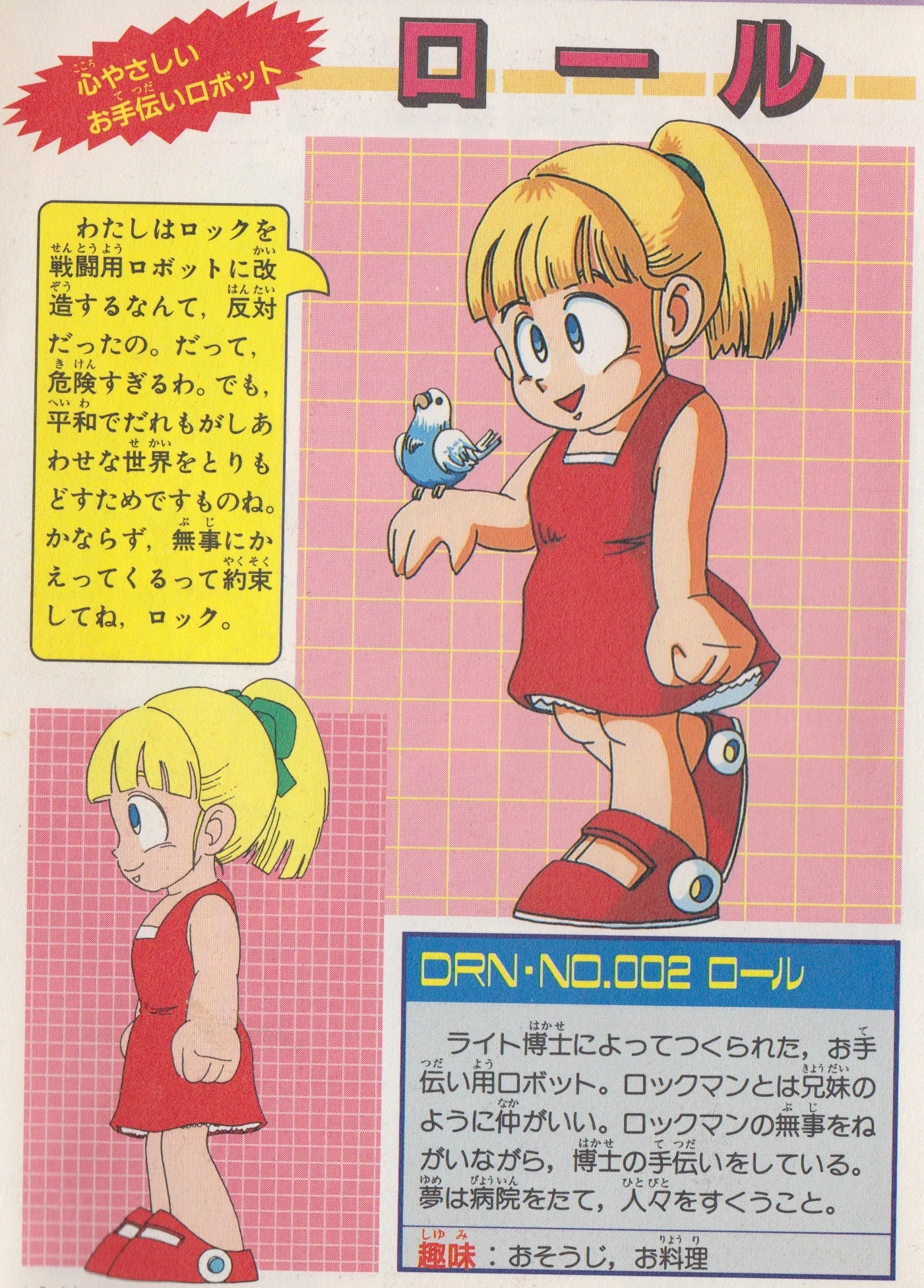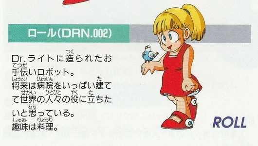 Roll Una robot asistente doméstica creada por el Dr. Right. La hermana menor de Rockman.[18] |