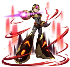 He has his own version of the X-Buster, being able to fire purple buster shots from it as well as an Armor Data Steal grab move which takes armor data from different armors X used. As a playable character, he utilizes the "Charge Shot -kai-" which allows him to store two charged shots, these projectiles can reverse the horizontal movements of whoever is hit. He also has an attack called "Multi-Chasing laser" which generates multiple projectiles from his body that can home in on enemies.