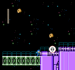 Asteroid[1] is a natural obstacle in Mega Man 5 and Mega Man for the Game Gear. It appears in the first part of Star Man's stage. It crashes down on to the ground. Despite not being robots, these will drop the normal power-up items when shot down before they collide. Asteroids have very little health, so their destruction is very easy. The Gravity Hold will remove all asteroids on the screen at once, making it a good choice weapon if being overwhelmed by asteroids.