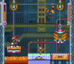 In Mega Man & Bass, a prototype of the bagworm part, named Atetemino Proto (アテテミーノ・プロト Atetemīno Puroto), appears in the first King Stage. It hides within an indestructible shell, and to raise it, the player must stand on a platform that's above a lava pit (beware not to stay on it too long). It attacks with missiles and miniatures of it that come out from the lava, while a robo-monkey named Monking A helps by throwing spheres at the player. Copy Vision is a big help here, to attack Atetemino while Mega Man/Bass stands on the platform. After its defeat, the player must be careful to jump from the platform, as it will fall on the lava.