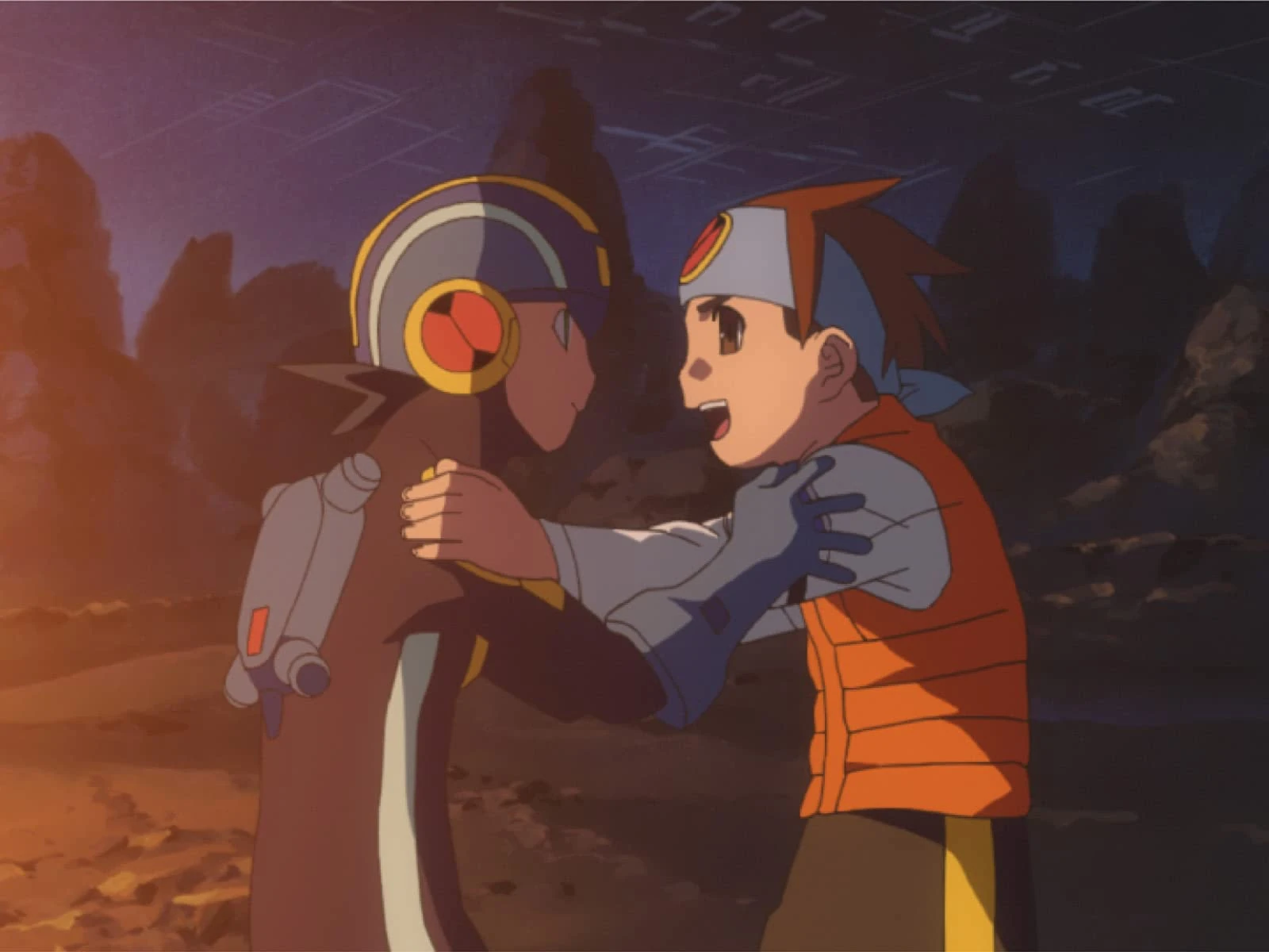 That night, all three groups learn more about the world they are in now from their location. At the abandoned city, while Meiru takes some rest, Enzan plug his and Meiru's PET to a still function computer, allowing their Navis to install the world's language. Blues also found the last news broadcast, showing natural disasters occurring everywhere in the world after the failed Dimensional Area experiment. This event was dubbed the Great Change. The same story was also told by Commander Mask to Raika and Dingo and Barrel to Netto. After the Great Change, NetNavis, Viruses and the Cyber Beasts begin to materialize in the real world and the war had caused much mishaps to those who remained neutral. Determine to make sure that neither Cyber Beasts wins, Netto agrees to help Barrel to stop them. Rockman attempts to say the same to Colonel but he coldly ignore his aid. Barrel reveals that in order to make Colonel a better soldier, he had removed several unnecessary data from him, mainly the kindness and personality data.