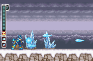 Blizzard Arrow is an EX Skill from Mega Man Zero 3. It can be obtained by defeating Blizzack Staggroff R with an A or S rank. It can be used by fully charging the Buster Shot with the Ice Chip equipped. When used, it fires a single ice-elemental sphere, which, after a brief delay, then produces 3 shards of ice that launch forward and have the ability to freeze enemies. Each shard, as well as the orb, have their own hit priority, giving this move up to four chances to hit enemies.