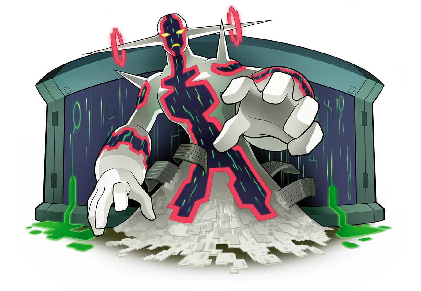 This is the form assumed by Cache after he absorbs all cache data in the server, causing him to transform into a massive, uncontrollable and monstrous form. A massive server appears behind him, filled with lines of green light, with what appears to be wires extending from the server into his body. The same green line patterns also appear on Cache's body, extending from his face to his lower body, with two more stripes on either arm. Cache's lower body becomes sluglike, apparently made up of fragmentary data.