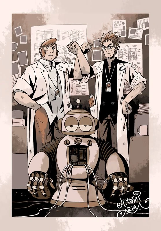 | Postcard of the black and white photo of Light and Wily when they were young working in a robot. | |