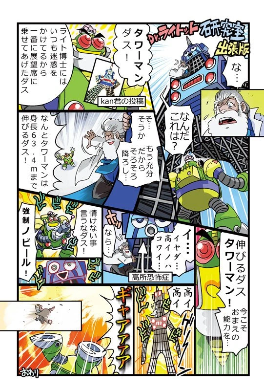 Rockman Maniax also had a bookmark from Animate shops and postcards from Fukkan.com. The back of the bookmark contains a four panel comic of X (with the Clear Buster) finding a capsule from Dr. Rightot.[21] The Fukkan postcards are either in color or monochrome, and contain a Dr. Auto's Laboratory story presenting Maneki-neko Man or Tower Man.[22] |