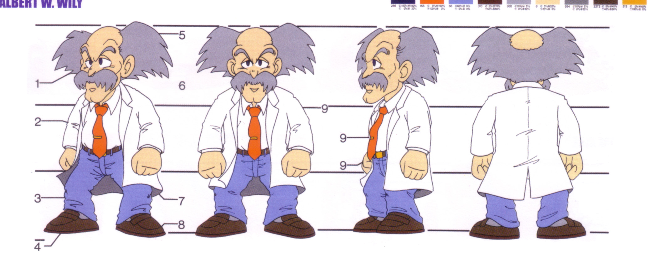 In Mega Man, Wily's character artwork depicts him as having a curly, balding hairstyle, as well as a curly thick moustache and being slightly pudgy with a white lab coat, a blue dress shirt and green tie, dark blue pants, and gray loafers. The design eventually evolved over time to have his hair stylized in his more trademark bat-wing-like style, as well as having a more lean appearance. However, his 8-bit sprites generally depicted him with his original design. In general, he is depicted in artwork, and to a certain extent his game sprite for Mega Man 7, as possessing gray hair and moustache, a cleft chin, as well as a white dress shirt, a red tie, blue pants, brown loafers, and a white lab coat.