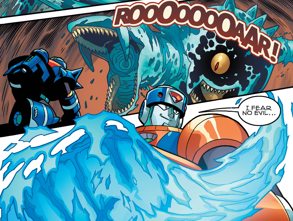 He debuted in the comics in Sonic Universe #51, where he received Dr. Light's message and began making his way back to earth. In Sonic Universe #53 he arrives at Light Labs, while in Mega Man #27 he is transported to the Skull Egg Zone, where he quickly boards the Wily Egg. Once aboard, he finds Mega Man and Sonic the Hedgehog battling the Chaos Devil, and after sharing some of his strength with them engages it while they continue on. Duo managed to re-form the Chaos Devil into Chaos' 0 Form by the climax of the arc.