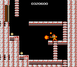 Fire Man's Stage takes place inside of what appears to be a steel foundry's smelting core. This stage has a lot of fire-related gimmicks moreso than enemies, which gives the stage a bigger focus on timing to avoid the obstacles. The first and most common of these is a block that unleashes a tall flame upwards within periodic intervals. This flame can actually be frozen with Ice Slasher, in which case it becomes a temporary platform. The other traps are unique to this stage. The second trap is a block that instead shoots fire horizontally, which is also periodical but always has a small flame at the nozzle which can still hurt the player. There are only 3 of these variants in the stage and they all appear together. The third trap is exclusive to one room near the end. Waves of fire will rush past a curving tunnel, and pixel-perfect timing is required to walk through it twice without getting hurt. (Magnet Beam can skip the entire gimmick). Lastly, the bottomless pits have magma, but this is purely aesthetic.