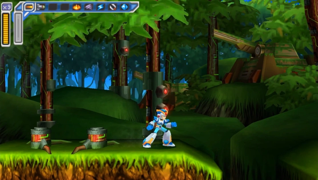 The forest is a front-line base heavily used in the Maverick uprising. The stage takes place on a rocky path throughout said forest, including a large cavern full of falling stones - going above the cave and defeating RT-55J will stop them and clear the way. There are also trees which Mad Peckers pull Creepers out of. After the cave, there is a muddy area that can be traversed using Ride Armor.