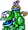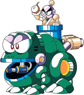 Gamarn and Gamadayu (ガマーンとガマ太夫 Gamān to Gamadayuu) is an optional mid-boss in Yamato Man's stage in Mega Man 6, only fought if Mega Man takes the lower path in the first branch of the stage, which can only be accessed with the Power Adapter. It is a team of the giant robotic frog Gamarn, a remodeled tank which shoots straight lasers from its mouth, and the samurai-like robot Gamadayu, who throws bombs in groups of two. It's only weak at the eyes of Gamarn and the body of Gamadayu, and goes down quickly to the Flame Blast and Silver Tomahawk. Punching the bombs with the Power Adapter will send the bombs back to him, defeating it with two bombs.