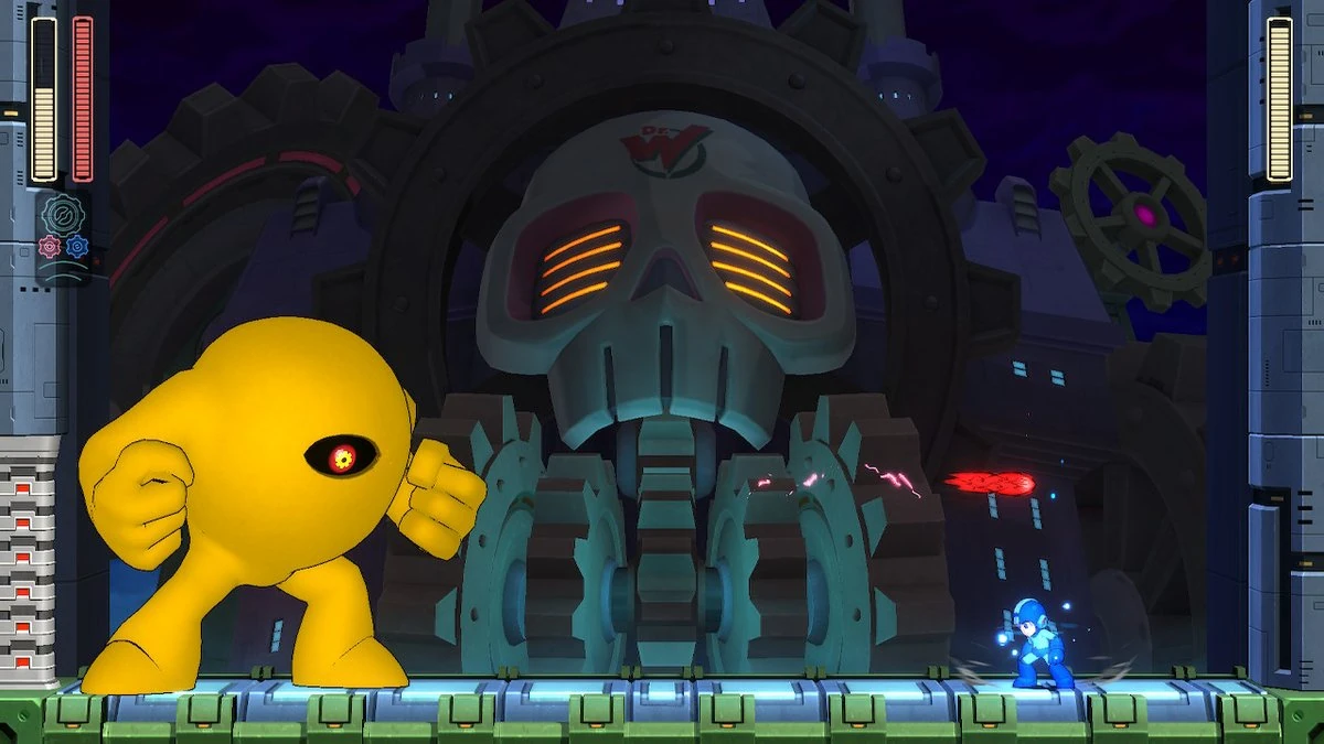 Gear Fortress (歯車城) is Dr. Wily's stronghold in Mega Man 11, replacing the Wily Fortress variants from the previous classic Mega Man games. Besides the skull motif common in Wily's fortresses, Gear Fortress uses gear motifs to tie in with the Double Gear System. It features two normal boss levels, a boss rematch level against the game's eight Robot Masters, and the final battle against Wily.