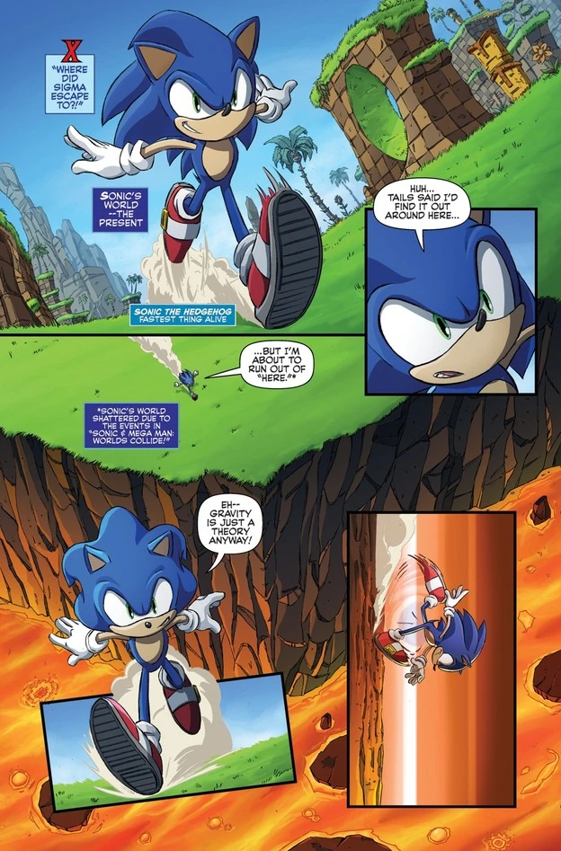 After the Genesis Wave that was launched by Dr. Eggman and Dr. Wily, Sonic found himself looking for his friends (Miles "Tails" Prower, Amy Rose and Knuckles the Echidna) in the Zone, with a feeling of Déjà vu. (Sonic Universe #51)