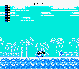 Ice Man's Stage takes place in an icy landscape and the caves within it. This is the first stage in the series to introduce ice-covered terrain and ice physics, where the player will keep sliding if they try to stop after moving. The first part of the stage has frozen tropical trees, suggesting that the snow is not part of the area's natural climate. Other gimmicks include water (though this is the only game where you can't actually jump higher underwater), a couple of rooms with Yoku Blocks, and the most notorious aspect of the stage: Foot Holders! They are orange platforms that move side to side over a large pit, and you have to jump across EIGHT of these (provided you don't have the Magnet Beam, poor soul). However, they also move up and down with no pattern to their altitudes, and they also shoot straight-moving projectiles off their sides. It is also possible to fall through them if you land on them when they're going up, or if you get hurt while they're going up.