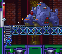 To destroy the tank, the player must destroy the three parts that can attack: the top cannon, the turret, and the hatch that releases Rompers. All three are only vulnerable when they use their respective attacks. The treads can also be attacked indefinitely, and if the player attacks them with Remote Mine, it will prevent the tank from charging at them; however, it is not necessary to damage them in order to defeat the tank. The stage consists of a wide battlefield with a lower subsection, accessible by two ladders on either side of the field. In that section, Mega Man and Bass can hide from most of the King Tank's attacks and damage it with Lightning Bolt.