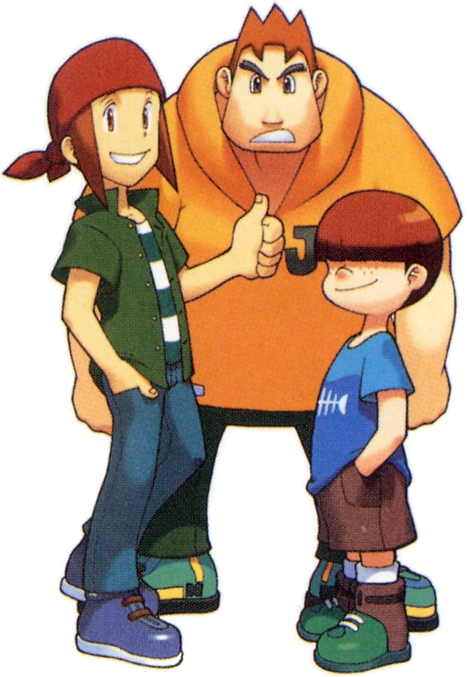 Jim (ジム), Osh (オッシュ) and Bensley (ベンスリー) are a trio of rascals that lives in Downtown. In the beginning of the game, they suspect Tron Bonne is a pirate and try to warn the police about her, but no one believes them, and they send a dog called Paprika to chase her. They later would ask MegaMan to help them build a "secret base" in Yass Plains by finding tools. After completing their base, Mega Man can exchange three items with Jim, one of them, the X buster, being necessary to create the Shining Laser.