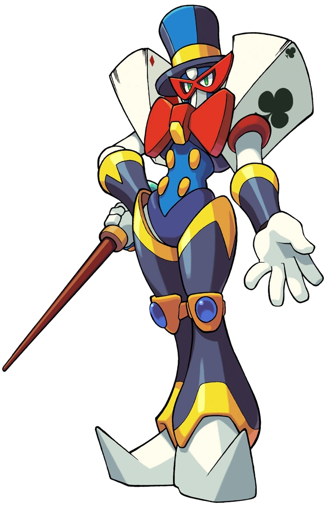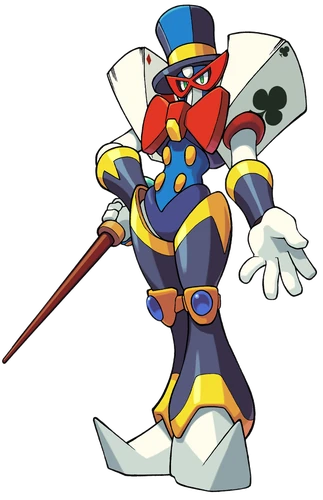 Magic Man (マジックマン Majikkuman) is an illusionist themed Robot Master, and a member of King's army. He was formerly a member of a circus, but he enlisted in King's army in order to show off his talents. His Special Weapon, the Magic Card, can steal energy from enemies to restore his health. His stage is one of the two stages unlocked by beating Ground Man.