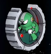 Mawaru C (マワルシー) is an enemy from Mega Man 11. It's a rotund greenish robot that rolls around inside a wheel-shaped vehicle that has one small opening. The outside of Mawaru C's vehicle is completely indestructible, so the only way to destroy one is to aim for the opening by firing at the right time, which can be made easier by using the Speed Gear so you have a larger window of opportunity to shoot at the opening, especially if it is rolling around in a smaller area. An alternative is using a Power Gear-enhanced Tundra Storm due to its ability to effect the entire area. Marawau C's make their most prominent appearance in Block Man's Temple, but can be found in other stages such as Impact Man's construction site and even the Gear Fortress.