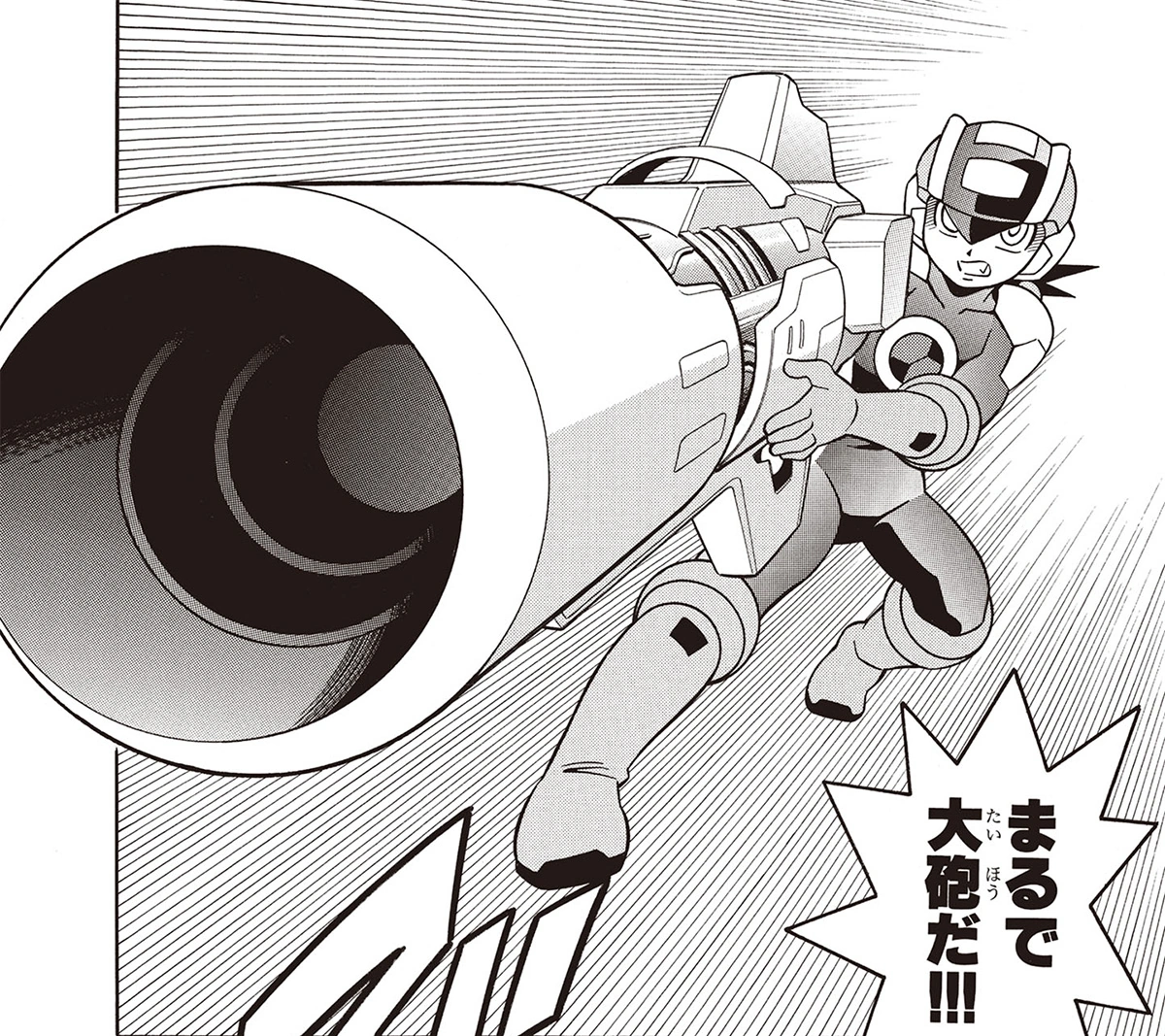 By the end of the manga, MegaMan reaches immeasurable power (he has to wear limiters to contain his power). He can evolve his Mega Buster into an enormous cannon that shoots a giant bullet.