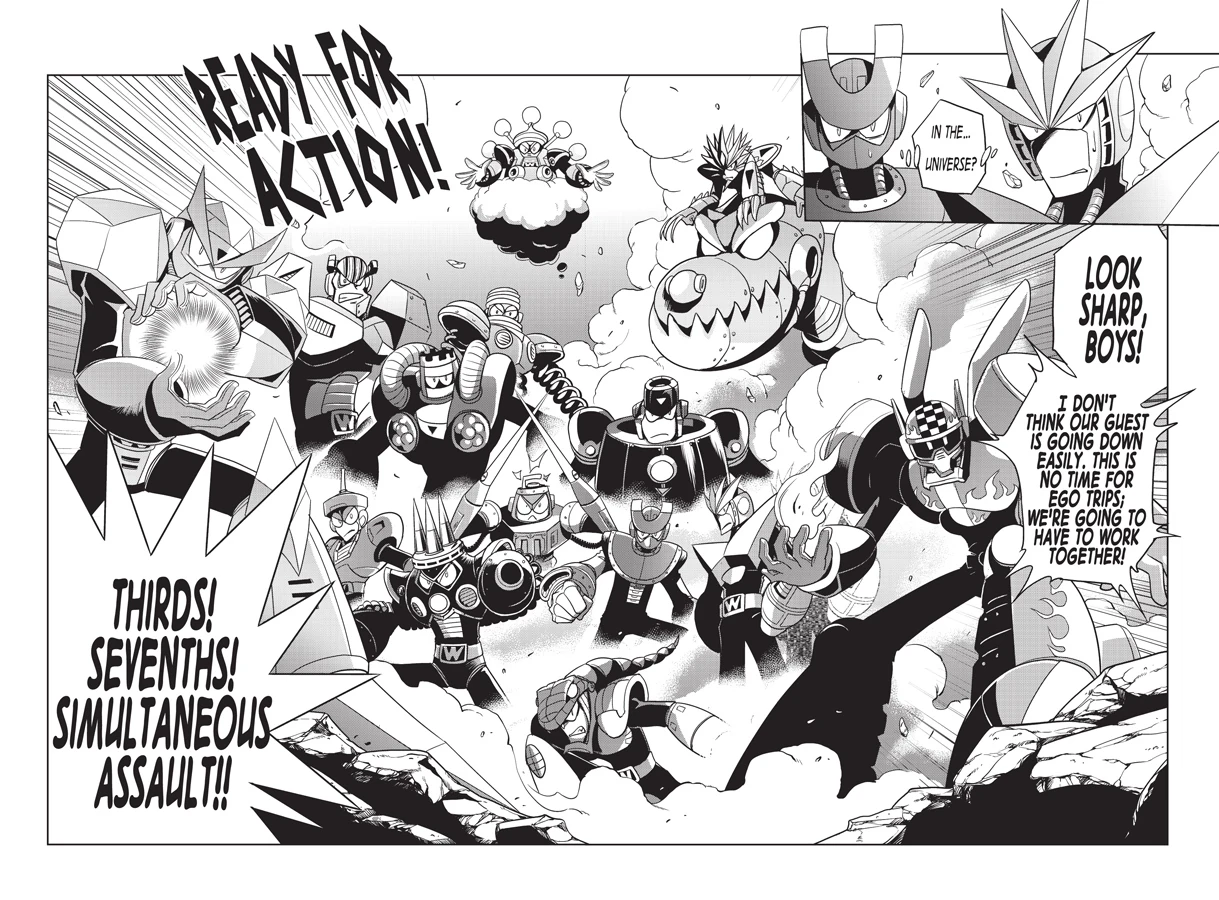 After defeating Venus, Duo fights against Jupiter, and he retreats. Meanwhile, Dr. Cossack's seven robots appear to help Mega Man's group, but for some reason they are out of control and attacks everyone present, and Uranus is destroyed when the seven attack him at the same time, which makes the other Stardroids retreat. When the seven Cossack Numbers harm Mega Man, they look confused and remove seven crystals from their bodies. Dr. Cossack appears with a helicopter and takes them to Dr. Light's lab, also taking the remains of the Mega Man 5 robots with him. The three doctors and their robots work together inside Big Eddie, repairing injured and broken robots. The Stardroids talk about their defeat partners and Terra takes Saturn's power, teleporting inside Big Eddie to attack. Terra teleports Duo to the other six Stardroids, where he is defeated by their combined attacks. Mega Man is fatally wounded, and Terra attacks everyone before leaving. When Shadow Man regains consciousness, he sees that the robots from Mega Man 2, 3 and 7 that were in Wily's base appeared and are assisting them. In other place, Proto Man decides to fight against the Stardroids, despite being alone and injured. While Light and Wily are repairing Mega Man, Cossack explains to the robots about Duo and the seven Energy Elements that were with his robots. Bass snatches four Energy Crystals for himself and goes after the Stardroids with Treble Boost, and the remaining three crystal are given for Mega Man, Shadow Man and Ring Man. They use one of Wily's remaining skull rockets from the Mega Man Megamix story R Destruction Order to send the three to space, with Star Man protecting it with his barrier.