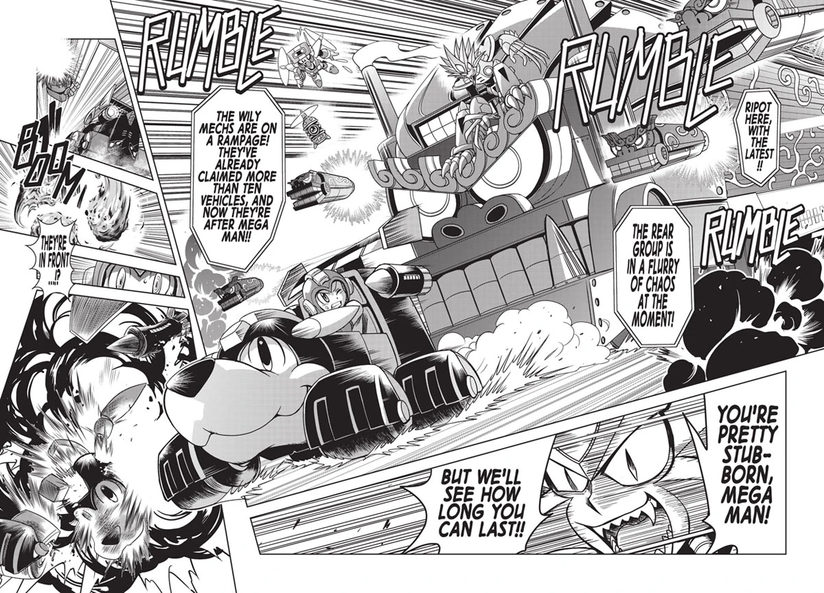 Burning Wheel (バーニングホイール Bāningu Hoīru) is a story from volume 1 based on Mega Man Battle & Chase and Mega Man 7, taking place after the story "The Greatest Enemy in History" from Mega Man Megamix.