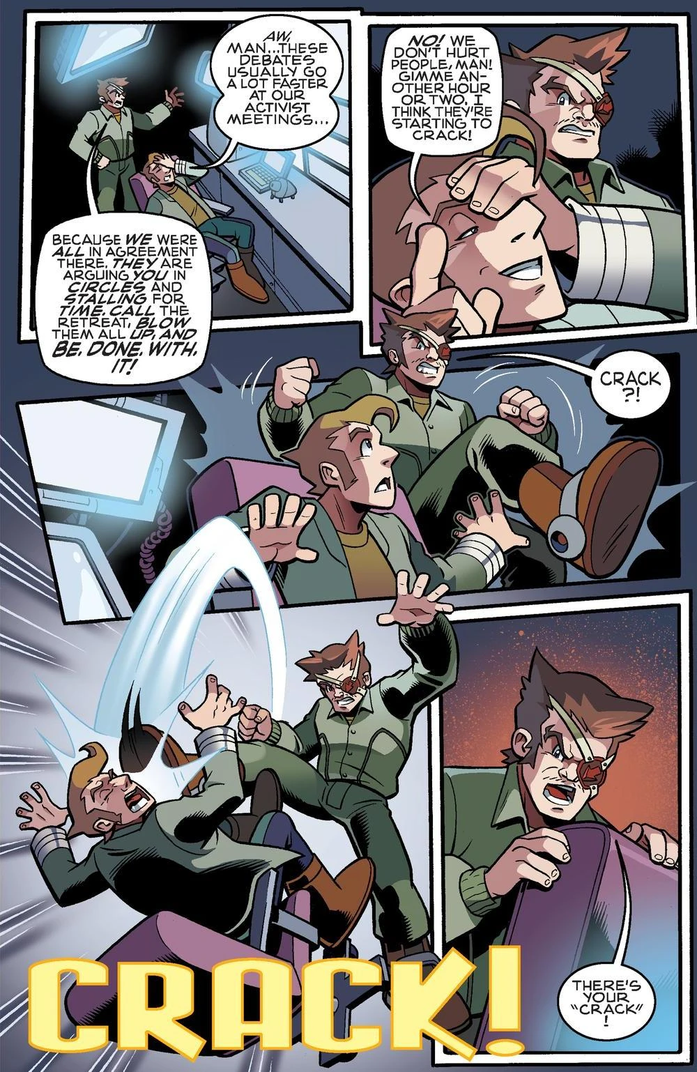 In the meantime, Harvey is losing the debate with the doctors. Harvey expressed disappointment that he is taking longer than expected to get the doctors to change their minds, citing that the debates usually went faster during their activist meetings. Xander then reminded him that during the "debates" for their activist meetings, everyone in the room agreed with Harvey, and pointed out that the doctors are arguing him in circles and thus are most likely stalling for time before demanding that Harvey call the retreat, blow up the convention center, and be done with it. Harvey dismisses him and tells him they don't want to hurt people, and states that he thinks he's close to "cracking" the doctors and requests that he just give him another hour or two to do so. Xander then gets enraged by how Harvey is not taking their goal seriously and proceeds to kick him upside the face, and commented that his "crack" just happened as he assumes control of Emerald Spears and threatens to destroy the robots and the doctors.