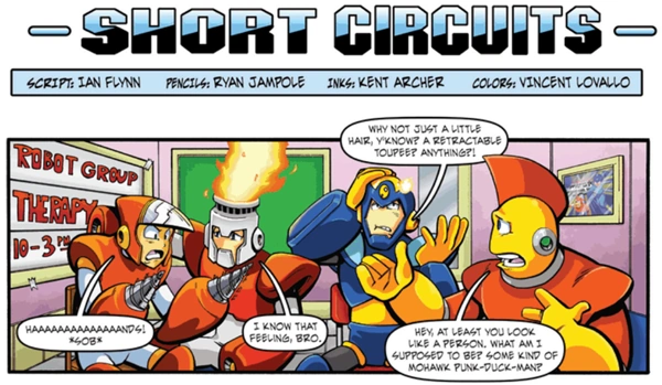 Robot Master group therapy. Fire Man comforts Crash Man over their mutual lack of hands, Flash Man continues to lament his baldness, and Bomb Man wonders just what the heck he's supposed to resemble in the first place.
