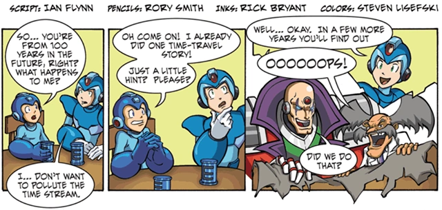 As X is from the future, Mega Man asks what happened to him. X doesn't want to "pollute the time stream", but Mega Man says he already did a time travel and pleads for at least a hint. X decides to tell him something that he will find out in a few years, but Wily and Sigma damage the story and the readers can't see what he says.