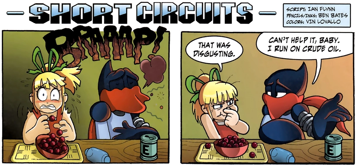 Oil Man gives off a disgusting belch and blames it on the fact that he runs on 'crude' oil when Roll objects.