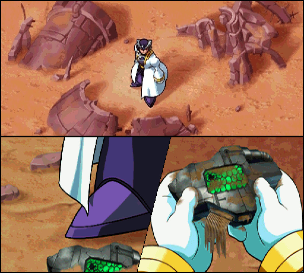 Gate: What is this? ...Hmm? This is... ...debris. But what from? ...Was there any violent battle here? I wonder how many people and Reploids were sacrificed? Um? Wait... Th... This is...!