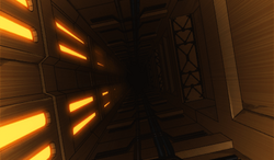 (Zero escorts a handcuffed Axl down a hallway leading to the Command Room of the Hunter Base.)