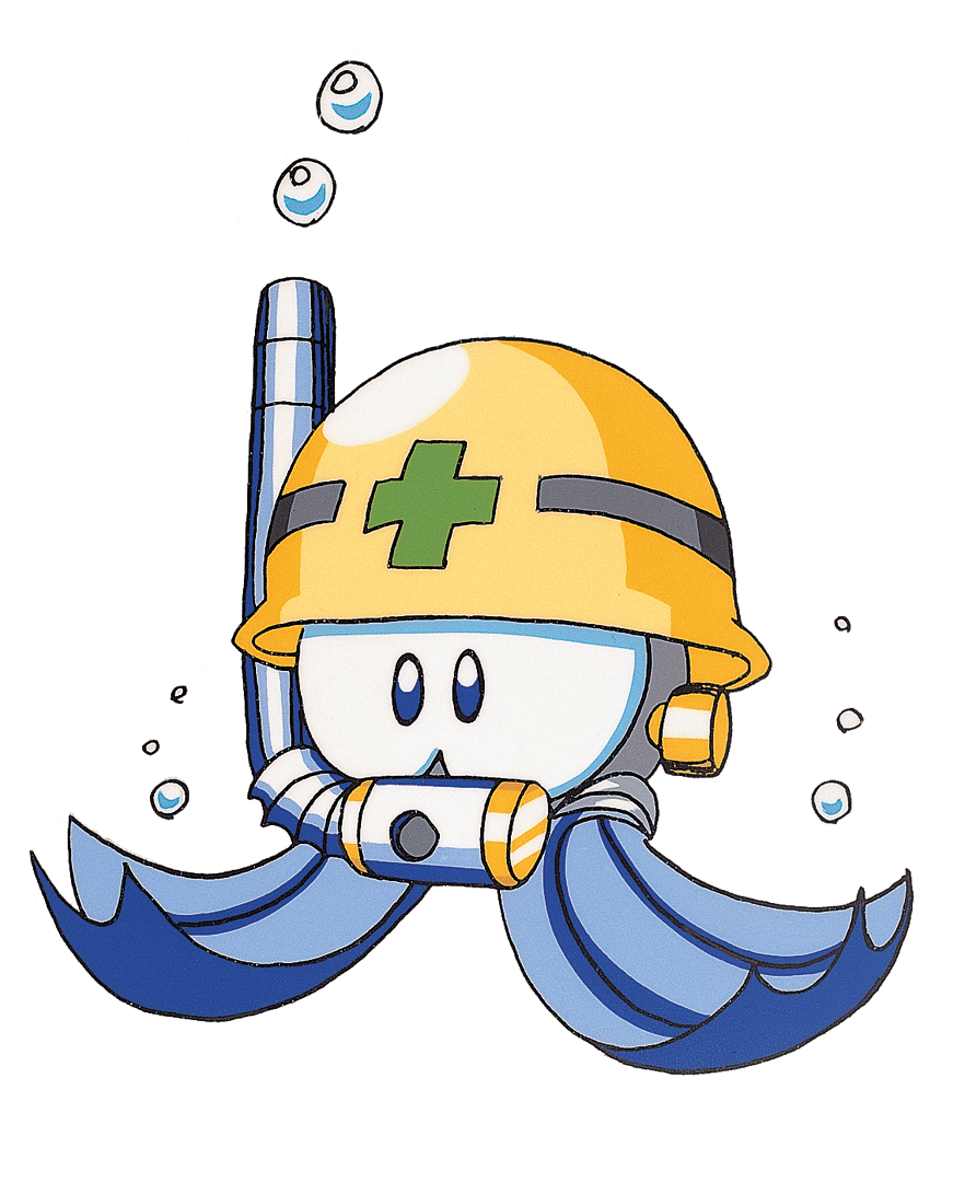Metall Swim (メットールスイム Mettōru Suimu) is a Met equipped with flippers and a snorkel that appears in Mega Man 4, Mega Man 5, Mega Man III, and Wily & Right's RockBoard: That's Paradise. There are deluxe versions of them in Mega Man 7 called Swim Metall DX.