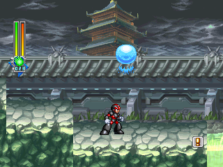 In normal fire, X creates a sphere of water that travels up to the top of the screen then travels downwards until it disappears upon hitting the ground. X can have up to two of these water orbs on the screen at a time. When charged, X shoots a sphere of water up, which then causes many orbs of water to fall diagonally.