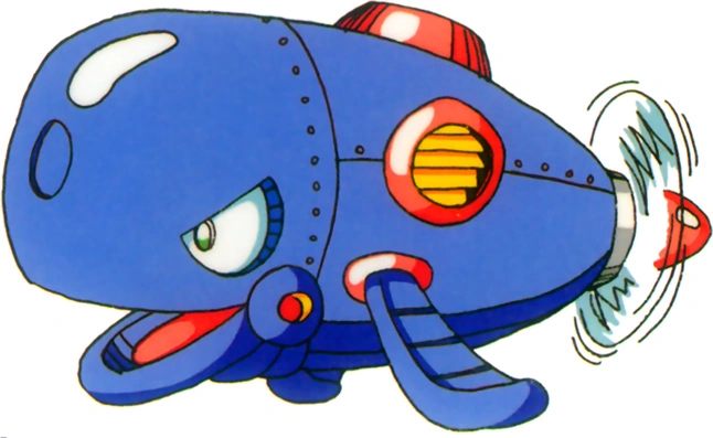 Moby (モビー Mobī) is a giant robot blue whale mid-boss that appears twice in Dive Man's stage. It was originally made to catch fish. It attacks with mines, missiles, and by trying to suck Mega Man in. It is weak to Drill Bomb.