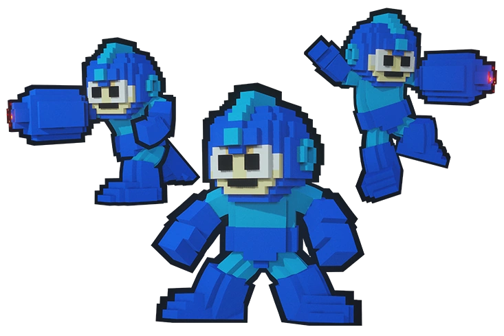 An 8-bit voxel style Mega Man armor could be crafted for Palicos by using Mega Man Tickets obtained in the 2018 Event Quest "A Rush of Blood" (ラッシュ大騒動), available from April 13 to April 27. Just like in Monster Hunter Generations, when the Palico consumes a Potion, he uses an E Tank instead.