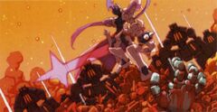 Omega spins in the air with the O-Saber, sending crescent waves in seven directions. | |
