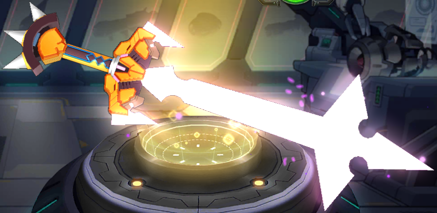 Omega slams the ground with the O-Saber, causing rubble to fall from above. | |
