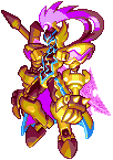 Omega takes this form using the full power of the Dark Elf. With three heads (Dark Elf's, X's, and Zero's), a sword so massive that the entire blade can't be seen, and a colossal cannon, Omega is a far more formidable opponent. The monster's only weak point is the central face, a relatively small target. Despite these new abilities, this form still pales in comparison to the final form. Again, this form's movement and attack patterns were limited due to the power and size of the Game Boy Advance screen.