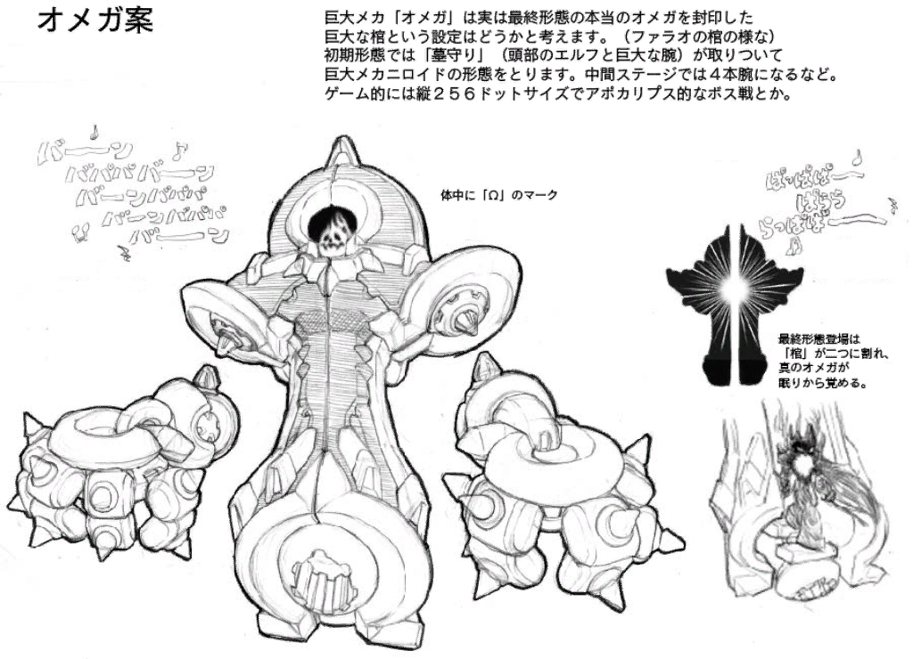 - Omega's early designs resembled a sarcophagus, with his true Zero body sealed within. The sarcophagus was designed like a giant Mechaniloid with several Ω shaped parts and a Cyber-elf-like glow at the head. When the final form appears, the sarcophagus splits down the middle, and the true Omega awakens from his slumber.[3]