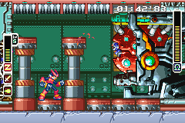 | Piston Attack | Pantheon Core tries to smash Zero into hidden spikes on the ceiling by lifting the six pistons on the floor, one at a time. | The speed and amount of pistons raised increase as its health is reduced, lifting up to five pistons in a row. |