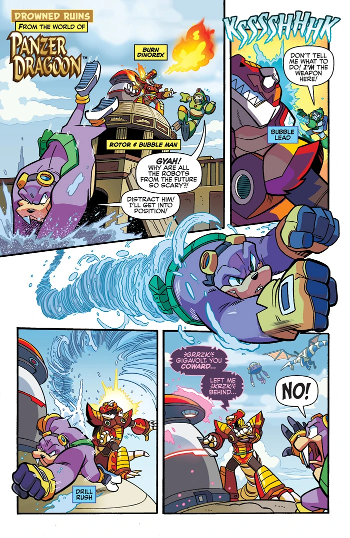 When Sigma sends several Mavericks to different worlds, Burn Dinorex and Gigavolt Man-O-War attempt to set an Unity Engine in the Drowned Ruins, but met local resistance. When Rotor the Walrus and Bubble Man fought Burn Dinorex and harm him, the latter expressed anger at Gigavolt abandoning him out of cowardice (as the latter was fleeing from the blue dragon and his rider) and managed to activate the Unity Engine, to Rotor's horror. Keil Fluge and the Blue Dragon arrive in the area and destroy the two Mavericks. With Rotor's guidance, they are able to destroy the Unity Engine by weakening its shield with the acid Bubble Lead and having the dragon fire at it.