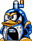 Penpen EV (ペンペンEV PenPen EV) is an upgrade of the Penpen, which resembles a Rockhopper Penguin. It spins around, and can be pushed aside with a few shots. But if left alone it will face Mega Man, get on its belly, and do a short gravity-defying jet boost to slide towards him. In Mega Man 8, Penpen EVs mainly dwell in Frost Man's stage. Many appear from the ice blocks that emerge from hovering Hogales. In Mega Man & Bass, Penpen EVs appear in Cold Man's stage.