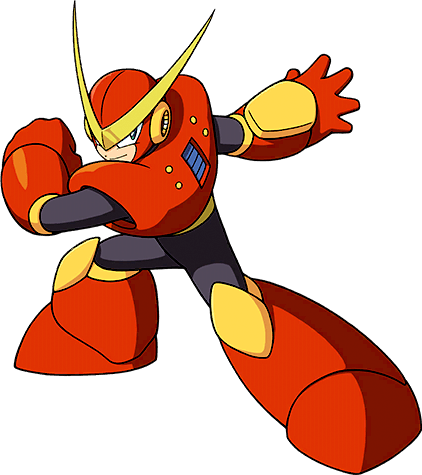 Quick Man is a humanoid robot who seemingly wears a black suit, a red torso with a yellow boomerang on front of it, red hands, red leg armors, red feet, and red helmet with a long yellow boomerang on the front. His eyes are blue.