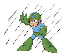 - The artwork of Mega Man using Rain Flush has a different color scheme in comparison to his in-game sprite with the weapon activated: in the artwork, his secondary color is blue instead of white, and in the in-game sprite, he appears lime green, while in the artwork, it's a more saturated and darker green.