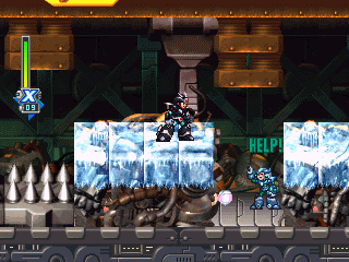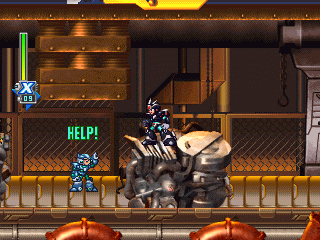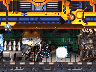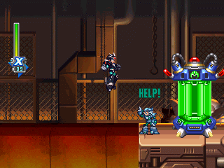 Almost the entire stage has a Nightmare Press garbage compactor on the ceiling that periodically descends, proving instantly fatal. However, it can be avoided by ducking into gaps in the floor along the way. Using a Ride Armor will also stop the compressor from crushing the player (even if the player is not in the Ride Armor, meaning it can be discarded to prop the compactor up).