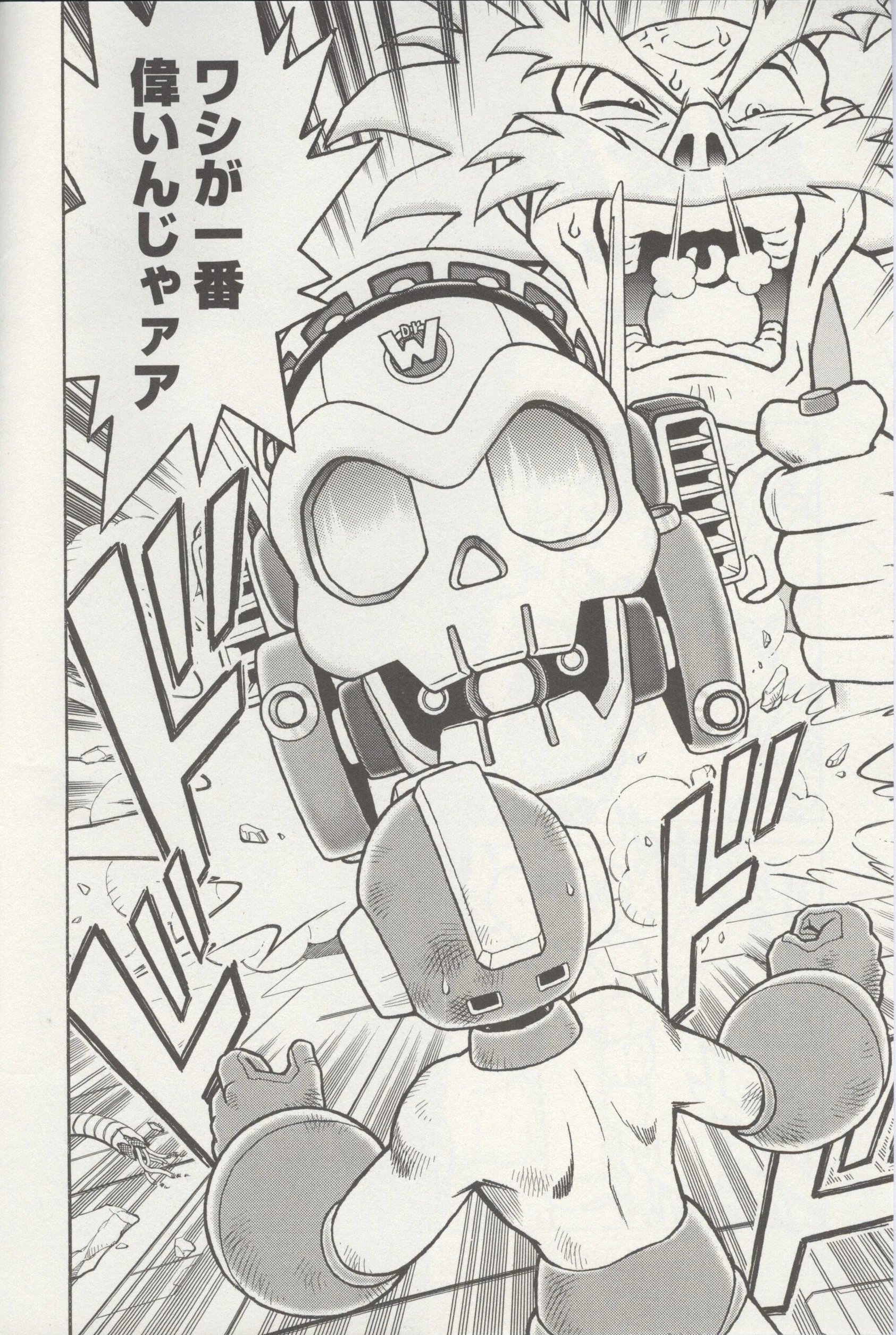 Hayate Tornado Hold (疾風トルネードホールド "Gale Tornado Hold"), originally Kūchū Daigekitō (Zenpen) ~Tenguman Hirai~ (空中大激闘 (前篇) ~テングマン飛来~ roughly "The Aerial Great Fierce Fight (First Part) ~Tengu Man Flying In~") is the third chapter. In Dr. Light's Laboratory, Dr. Light, Rock and Roll see in a newspaper that an energy research institute had mysteriously disappeared one night, a large crater appearing where it was located, and the whereabouts of both Dr. Cossack and Kalinka are unknown. Meanwhile, Dr. Wily is talking with Dr. Cossack, and he shows the unknown energy he had found, which surprises Cossack. In Dr. Light's Lab, the unknown robot (Duo) that was being repaired awakens and leaves. Rock changes into Mega Man and goes after the robot with Rush.
