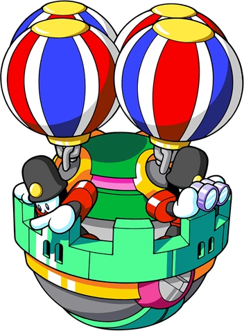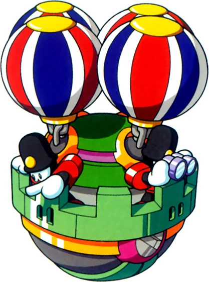 The Kikyoon (キキューン Kikyūn) is the Rompers' main aircraft. One Romper uses binoculars to guide the others, while they drop capsules containing Rompers. These balloons only appear in Clown Man's stage from Mega Man 8. Its name comes from the Japanese word for balloon (気球 kikyū).